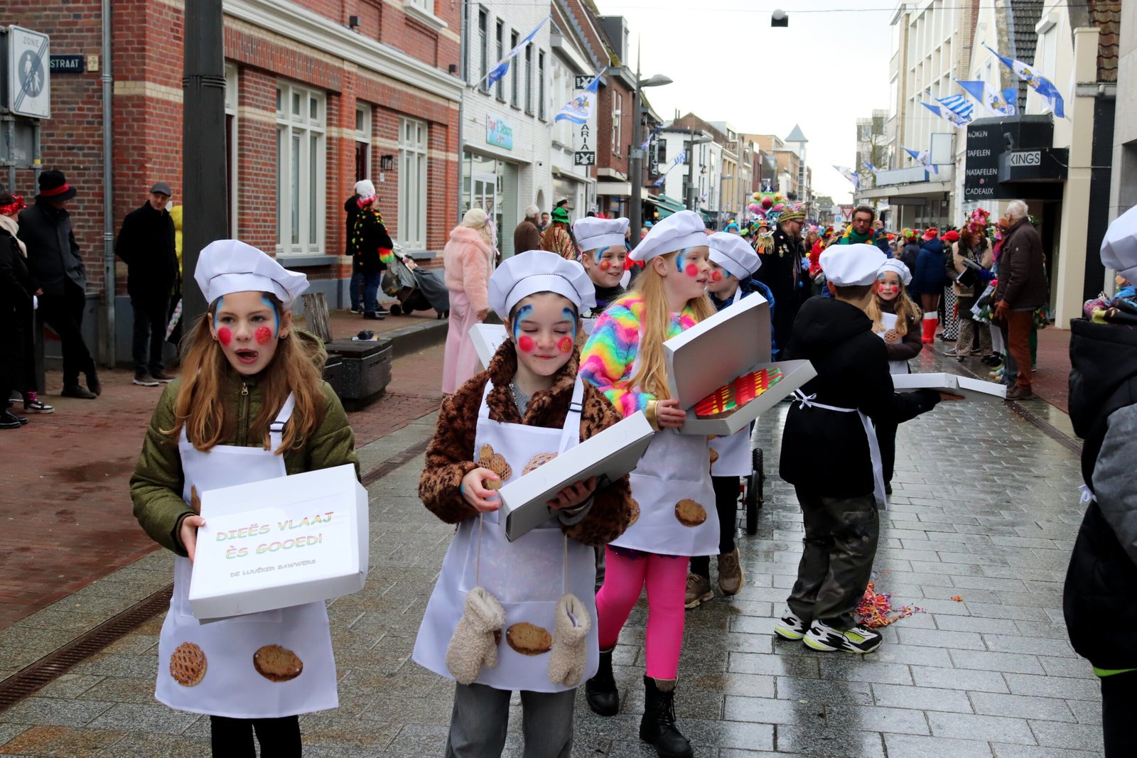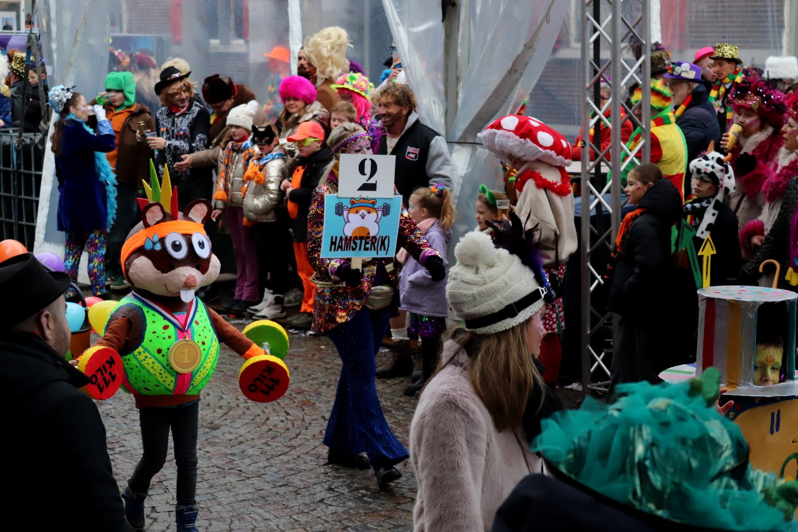 Al di-j wichter, di-j mej dieëje aan eure eige optocht, haaje gelök mét 't waer. Ze koeëme druuëg aan beej 't podium, woeë det ze as beloeëning 'ne snuikbuul én ouch nog 'n herinneringsmedalie krieëge. Det waas nao aafloup van 'ne optocht, woeë dejje as pebliek allein mer kosj geneête van al di-j bli-j gezichtjes inne stoet. Want det waas de beloeëning vör de minse langs de kânt. Mer 't ging um mieër dan wat snuik en 'n medalie. Det blieëk waal beej de prieësuitreiking.